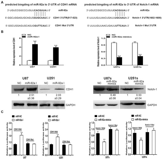 CDH1 and Notch-1 are direct targets of miR-92a-3p in glioma cells and GSCs, respectively. (A) Targeting sequences and mutated nucleotides of miR-92a-3p in 3′ UTR of CDH1 and Notch-1; (B) The mRNA and protein expression levels of CDH1 in glioma cells and Nocth-1 in GSCs were evaluated by qRT-PCR and Western blotting; (C) Relative luciferase activity of wild-type 3′ UTR and mutant type 3′ UTR of CDH1 and Notch-1. Each bar represents the mean of three independent experiments. ** indicates p < 0.01.