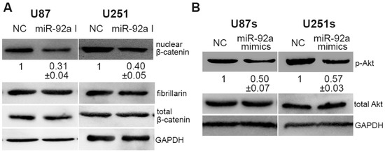 Functional validation of CDH1 and Notch-1 are the crucial effectors for miR-92a-3p prompted us to investigate additional downstream effectors of miR-92a-3p in two cell types. Previous studies denote that CDH1 is a negative regulator of the translocation of β-catenin from the cell membrane to the cytoplasm and nucleus, which has been implicated in cancer development and progression [21]. More important, Li et al. demonstrated that Akt is required for Notch-1-facilitated malignant behavior in breast cancer cells [22]. Therefore, we proposed that CDH1/β-catenin and Notch-1/Akt may be the downstream signaling pathway of miR-92a-3p in two cell types. Western blotting results showed that decreasing miR-92a-3p represses the protein level of nuclear β-catenin, whereas the total expression level of β-catenin remains unchanged in glioma cells (Figure 5A). As illustrated in Figure 5B, increasing miR-92a-3p reduced the phosphorylation level of Akt in GSCs. In contrast, no significant effect was found on total Akt. Collectively, these data demonstrated that miR-92a-3p targeted CDH1/β-catenin and Notch-1/Akt signaling pathways in glioma cells and GSCs, respectively.