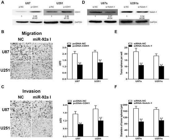 miR-92a-3p plays different roles in glioma cells and GSCs through targeting CDH1 and Notch-1, respectively. (A) Protein expressions of CDH1 in gliomas were measured by Western blotting; (B,C) Migration and invasion ability of glioma cells were detected through applying Transwell assay; (D) Protein expressions of Notch-1 in GSCs were qualified via Western blotting; (E,F) Stem-like traits of GSCs were evaluated by tumor sphere formation assay and diameters of GSCs. Each bar represents the mean of three independent experiments. ** indicates p < 0.01. Scale bar represents 200 µm.