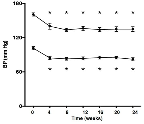 The participants took olmesartan 5–40 mg/day for 24 weeks. Blood pressure was checked every 4 weeks, and the amount of olmesartan was adjusted based on blood pressure (less than 130/85 mmHg and more than 100/50 mmHg). If blood pressure in patients who took 40 mg/day olmesartan over 8 weeks reached more than 150/100 mmHg, they were excluded. Blood and urine samples were collected at baseline (0 weeks) and at 12 and 24 weeks after treatment. Blood pressure was measured at baseline (0 weeks) and 4, 8, 12, 16, 20 and 24 weeks after treatment in clinic.
