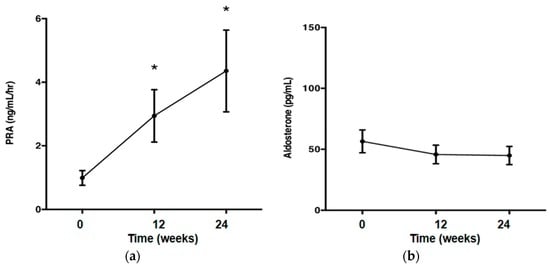 (a) Plasma renin activity was increased after the treatment with olmesartan; (b) treatment with olmesartan did not affect plasma aldosterone concentrations. One-way repeated measures ANOVA followed by Tukey’s multiple comparisons test were used to compare values over the time course. p < 0.05 was considered as statistically significant (* p < 0.05).