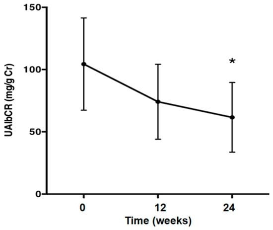 The urinary albumin/creatinine ratio was decreased after the treatment with olmesartan. One-way repeated measures ANOVA followed by Tukey’s multiple comparisons test were used to compare values over the time course. p < 0.05 was considered as statistically significant (* p < 0.05). UAlbCR, average urinary albumin/creatinine.