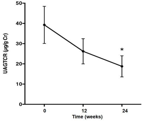 The urinary angiotensinogen/creatinine ratio was decreased after the treatment with olmesartan. One-way repeated measures ANOVA followed by Tukey’s multiple comparisons test were used to compare values over the time course. p < 0.05 was considered as statistically significant (* p < 0.05). UAGTCR, average urinary angiotensinogen (AGT)/creatinine.