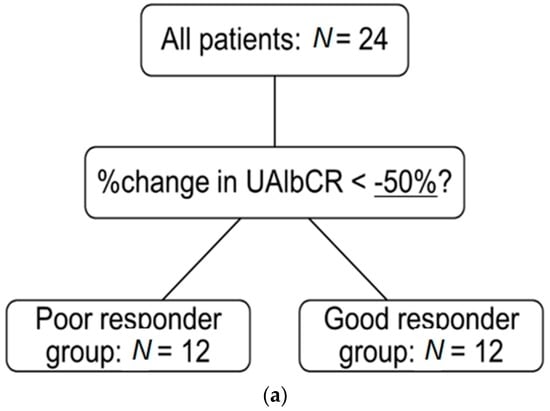 (a) Patients were divided into two groups based on whether or not the urinary albumin/creatinine ratio decreased less than 50%. The good responder group was defined as % change in urinary albumin/creatinine ratio <−50%; (b) Logistic analysis was conducted by the urinary angiotensinogen/creatinine ratio before the treatments. The receiver operating characteristic (ROC) curve was plotted. The vertical axis shows whether the urinary albumin/creatinine ratio decreased less than 50%; (c) Area under the curve (AUC): 0.694; cutoff value of urinary angiotensinogen/creatinine ratio: 13.9 µg/g Cr; maximum Youden index: 0.500 ((b,c) specificity: 11/12 = 91.7% and sensitivity: 07/12 = 58.3%).