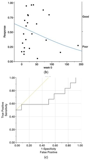The average urinary albumin/creatinine (Cr) ratio (UAlbCR) (p < 0.05; Figure 3) and the average urinary AGT/creatinine ratio (UAGTCR) (p < 0.05; Figure 4) were decreased after the 24-week treatment with olmesartan. Patients were divided into two groups based on whether or not UAlbCR decreased less than 50% (Figure 5a). The data of the clinical characteristics of the good responder group and the poor responder group at the baseline are given in the Table 3. Logistic analysis was conducted by UAGTCR before the treatments. When a receiver operating characteristic (ROC) curve was plotted, the area under the curve (AUC) was 0.694. When the cutoff value of UAGTCR before the treatments was set as 13.9 μg/g Cr, the maximum Youden index (0.500; Figure 5b,c; specificity: 11/12 = 91.7% and sensitivity: 07/12 = 58.3%) was obtained.