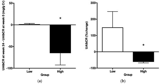 Based on this cutoff value of UAGTCR at baseline, all patients were divided into two groups: the higher (Group H, N = 16) and the lower (Group L) group. Clinical characteristics (Table 4) and baseline laboratory data (Table 5) were not significantly different between Group H and Group L. Under these circumstances, ΔUAlbCR was significantly lower in Group H than in Group L (Figure 6a). Moreover, the % change in UAlbCR was significantly lower in Group H than in Group L (Figure 6b).
