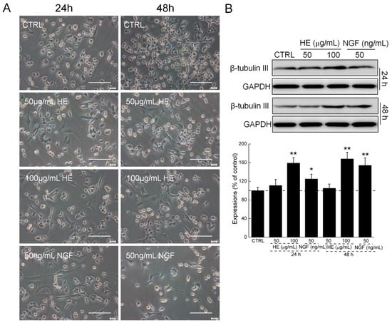 Comparatively, the control cell types were round, triangular, and irregular short spindle, and exhibited well refraction under an inverted microscope. Similarly, regarding NGF, after incubation with 50 and 100 µg/mL of HE for 24 and 48 h, respectively, the bodies of the PC12 cells became polygons or polygonal. Combined with the increased HE concentration, the cell axons were similar to neurons, and the differentiation rate was significantly enhanced (Figure 1A). Both NGF and HE strongly enhanced the expressions of β-tubulin III in PC12 cells after 24 and 48 h incubation (Figure 1B).