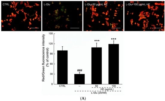 JC-1 (5,5’,6,6’-tetrachloro-1,1’,3,3’-tetraethylbenzimidazolylcarbocyanine iodide) molecular probe staining was applied to detect mitochondrial function. Although the control cells exhibited the intense red fluorescence indicative of healthy cells, the 12 h l-Glu-incubated cells exhibited the intense green fluorescence indicative of mitochondrial apoptosis (p < 0.001; Figure 3A). Comparatively, HE preincubation strongly enhanced the ratio of red-to-green fluorescence, suggesting its beneficial activity on mitochondria (p < 0.001; Figure 3A).