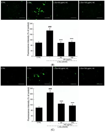Three-hour HE preincubation followed by another 12 h coexposure to l-Glu strongly reduced high green fluorescence in DCFH-DA (2’,7’-dichlorofluorescein diacetate) staining, suggesting its inhibition of ROS accumulation (p < 0.001; Figure 3B), which was also confirmed using the flow cytometry method (Figure S1).