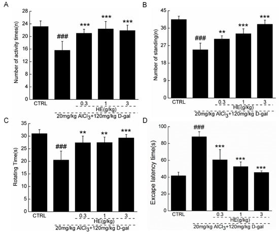 It has been reported that ROS formation, mitochondrial membrane depolarization, and ATP/ADP ratio decrement within mitochondria were noted in the brains of memory-impaired rats [28]. The neuroprotective effects of HE were investigated in AD mice, but due to the complex pathology and physiology in AD, it is difficult to develop an ideal animal model of AD for basic research [29]. A d-gal-induced neurodegenerative disease animal model was first reported by Chinese scholars [30]. Galactose alcohol, the metabolism of d-galactose, accumulates in cells, which results in the swelling and dysfunction of brain cells and, ultimately, nerve injuries [28]. Furthermore, excessive exposure to and accumulation of aluminum may be one cause of AD [31]. Aluminum causes neuronal vacuolization, followed by cerebral cortex atrophy and cognitive and memory dysfunction [31]. In AlCl3- and d-gal-induced AD mice, Pleurotus ostreatus polysaccharides successfully improved their cognition [32]. Learning and memory loss, slow behavior, and other signs of aging were widely noted in AD mice, and they were all strongly alleviated by HE based on autonomic activity analysis and rotarod and water maze tests.