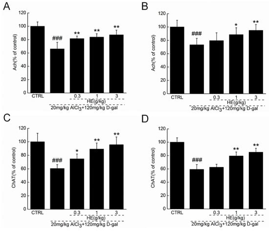 HE treated AlCl3- and d-gal-induced AD mice for four weeks, and blood and hypothalamus were collected. The levels of (A) acetylcholine (Ach) and (C) choline acetyltransferase (ChAT) in hypothalamus, and the levels of (B) Ach and (D) ChAT in serum were detected via ELISA method. Data are expressed as the percentage to controls and mean ± SD (n = 10). ### p < 0.001 vs. normal mice (CTRL), * p <0.05 and ** p < 0.01 vs. AD mice. HE: Hericium erinaceus aqueous extract.