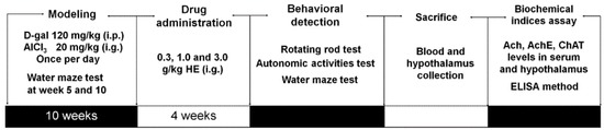 AD mouse model establishment and drug administration process is shown in Figure 6 [28]. 40 mice were subcutaneously injected with 120 mg/kg of d-gal and intragastrically administrated with 20 mg/kg of AlCl3 once per day continually for 10 weeks. Water maze tests were tested at the 5th and 10th week to evaluate modeling effect. All successfully developed AD mice were randomly divided for four groups (n = 10) and orally treated with normal saline (AD model mice), and HE at doses of 0.3, 1.0, and 3.0 g/kg for 4 weeks. Another 10 mice subcutaneously injected and orally treated with normal saline for 10 weeks, and intragastrically treated with normal saline for another 4 weeks served as control group. At the end of experiment, animal behavioral tests were assessed. Before sacrifice, blood was sampled under anesthesia. After sacrifice, hypothalamuses were collected from each mouse, and homogenized in D.D. water.