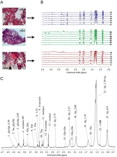 Figure 1. 1H HR-MAS (high-resolution magic-angle spinning) spectra of multiple biopsy specimens. (A) From top to bottom: representative hematoxylin and eosin-stained morphological sections of samples belonging to group A, B, and C, respectively; (B) Overlay of the spectra acquired on the different specimens; the labels on the right indicate group and sample ID; (C) Representative 1H 1D-noesygppr HR-MAS nuclear magnetic resonance (NMR) spectrum of group A sample. Assignment was made on the basis of literature references [7,22,24,25,26,27]. Peaks were calibrated using DSS (4,4-dimethyl-4-silapentane-1-sulfonic acid) peak at 0 ppm as reference. Numbers identify binning regions as listed in Supplementary Table S1. (1) glycerolipids; (2) lactate, glycerolipids; (3) glycerolipids; (4) creatine and phosphocreatine; (5) glycogen, glucose; (6) glycine; (7) taurine; (8) unknown; (9) scyllo-inositol; (10) taurine; (11) choline, O-phosphocholine, and glycerophosphocholine; (12) phosphocreatine; (13) creatine; (14) triglyceride =CH–CH2–CH=; (15) glutamate and glutamine; (16) triglyceride CH2–CH2CO; (17) glutamate and glutamine; (18) triglyceride CH=CH–CH2; (19) triglyceride CH2–CH2CO; (20) alanine; (21) triglyceride (CH2)n, lactate and threonine; (22) 3-hydroxybutyrate; (23) triglyceride CH3–(CH2)n.