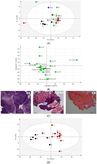 In order to identify differences and similarities between sample groups and to obtain an unbiased overview of the NMR dataset we applied principal component analysis (PCA). The PCA score plot and loadings plot of NOESY data are shown in Figure 3A,B, respectively. The first two principal components accounted for 78% of variance, showing that separation of samples based on their type of origin was mainly achieved through the first principal component (PC1), which had a large positive loading for bin 21 (around 1.3 ppm) and negative loading for glycogen–glucose (bin 5, around 3.7 ppm) (Supplementary Table S1). The quality control sample A4/B4, prepared mixing muscle and tumor specimens, contained both tumor cells and muscle fibers. As expected, in agreement with its mixed origin, its PCA score was within 95% confidence, even though it was far from the centroids of both groups A and B. Notably, the PCA score plot was characterized by the presence of two outliers (B8 and C8 samples), which were outside the 95% confidence interval of the dataset. These samples, during insert preparation for 1H HR-MAS experiments, were classified by visual inspection as oily and calcified tumors, respectively. However, histological examination revealed an erroneous classification, as assessed by the presence of high concentration of small cells in both C8 and B8 samples, with a muscle fiber trapped in B8 (Figure 3C).