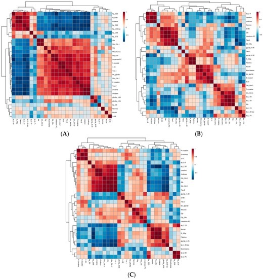 Figure 4. Integrated correlation analysis of histomorphometry and 1H HR-MAS NMR profiling data. Joint correlation heatmaps consisting of histomorphometry and 1H HR-MAS NMR profiling datasets (including 5 histomorphometric features and 23 NMR bins/metabolites) obtained considering (A) all samples without outliers (n = 13); (B) only muscle samples (n = 6); (C) only tumor samples (including both B and C samples, n = 7). In each matrix histomorphometry data were normalized to total area and scaled to range, while NMR data were normalized to the sum of intensities and Pareto-scaled. NMR bins/metabolites are consistent with Supplementary Table S1. The color of each cell depicts the Spearman-rank correlation coefficients and clusters according to Euclidean distances (pheatmap library in R) using a thermal scale from anticorrelation (r = −1, blue) through uncorrelated (r = 0, white) to correlated (r = 1, red). Histomorphometry and NMR data are explicitly labeled on the bottom and on the right of the symmetric matrix, respectively. On the top and on the left of the matrices, dendrograms of the clustering are shown.