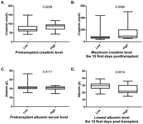 We then compared contrasting groups with high and low weight gain; based on the later use of maximal weight gain as a continuous variable and the use of dummy variables to define cut-off in the survival analyses (see section 2.8 below) we then used a cutoff of 6.8 kg to define two contrasting groups, i.e., patients with low and high weight gain, respectively. Firstly, the median pretransplant creatinine kevel for all 100 patients was 72 µM (variation range 42–149 µM). Patients with weight increase exceeding 6.8 kg had a significantly higher creatinine levels prior to conditioning therapy compared with the other patients (p = 0.02), and this differences remained significant also when comparing creatinine levels 14 and 28 days after transplantation. Secondly, the preconditioning albumin levels did not differ between these two groups, whereas the albumin levels were significantly lower for patients with maximal weight gain exceeding 6.8 kg both when comparing these two groups 14 and 28 days after transplantation (Figure 1). Thirdly, the cyclosporine A levels did not differ between the two groups.