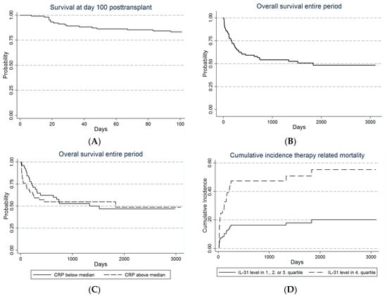 The Kaplan–Meier plot of overall survival 100 days post-transplant is shown in Figure 2A; the overall survival at Day +100 being 82% The crude analysis of TRM at Day +100 post-transplant showed significant associations with maximum weight gain, pretransplant IL-6 and IL-31 levels, type of transplantation and pretransplant CRP level above median (Table S6; p-values < 0.05). The effect of CRP on overall survival is also presented in Figure 2.