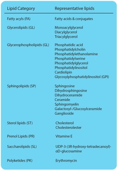 - Fahy, E.; Subramaniam, S.; Murphy, R.C.; Nishijima, M.; Raetz, C.R.; Shimizu, T.; Spener, F.; van Meer, G.; Wakelam, M.J.; Dennis, E.A. Update of the lipid maps comprehensive classification system for lipids. J. Lipid Res. 2009, 50, 9–14. [Google Scholar] [CrossRef] [PubMed]