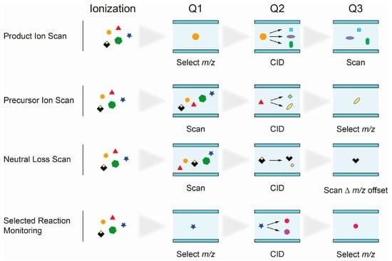 - Product Ion Scan: fragments of precursor ions, selected in Q1, are analyzed in Q3 after fragmentation in Q2. It is commonly used to study the fragmentation patterns of lipids.