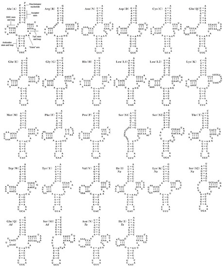 - Lowe, T.M.; Eddy, S.R. tRNAscan-SE: A program for improved detection of transfer RNA genes in genomic sequence. Nucleic Acids Res. 1997, 25, 955–964. [Google Scholar] [CrossRef] [PubMed]