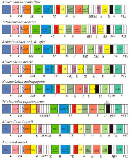 - Thao, M.L.; Baumann, L.; Baumann, P. Organization of the mitochondrial genomes of whiteflies, aphids, and psyllids (Hemiptera, Sternorrhyncha). BMC Evol. Biol. 2004, 4. [Google Scholar] [CrossRef] [PubMed]