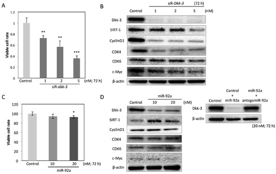 Each examination was performed in triplicate. The cell count analysis and the expression levels of mRNAs in the cells transfected with miR-92a and those transfected with nonspecific control miRNA were compared by using Student’s t-test. A p-value less than 0.05 was considered to be statistically significant.
