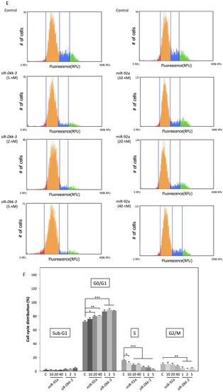Quantification of cellular DNA content at 48 h after transfection with non-specific control, miR-92a (10, 20 or 40 nM) or siR-Dkk-3 (1, 2 or 5 nM) was determined by using a cytometer. Briefly, the cells were harvested and fixed with 70% cold ethanol at −20 °C overnight. The fixed cells were washed twice with PBS, resuspended in 100 μL PBS-based propidium iodide solution containing 0.1% Triton X-100 (Wako Pure Chemical Industries, Ltd., Osaka, Japan), 0.2 mg/mL RNase A (Invitrogen) and 20 μg/mL propidium iodide (Invitrogen) and incubated for 30 min at room temperature protected from the light. The DNA content in the cells was analyzed through the cytometer (The Tali® Image-Based Cytometer, Invitrogen).
