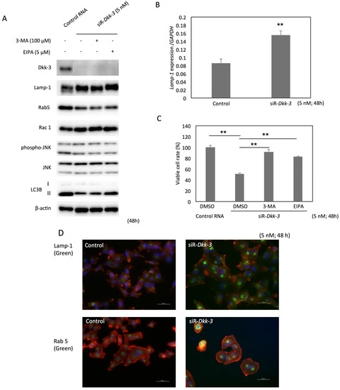 The morphological observation by electron microscopy revealed that the accumulated vesicular structures were different from autophagosomes or apoptotic bodies (Figure 2H). Western blot analysis at 72 h after the siR-Dkk-3 transfection detected an increase in the 42-kDa fragment of PARP-1, but not conversion of LC3B-I to LC3B-II (Figure S1). Lamp-1, a lysosomal membrane protein, was upregulated, while Rab5, an early endosomal component, was downregulated at 48 h after the Dkk-3 knock-down (Figure 3A). As to Lamp-1, the level of Lamp-1 mRNA was also elevated after Dkk-3 knock-down (Figure 3B). The Wnt-Rac1-JNK axis was inactivated, whereas the p38 and Erk1/2 pathways were activated (Figure S1). These results indicate that the Dkk-3 knock-down stimulated a kind of endocytic process, morphologically considered to be a macropinocytosis, which represents a biologically important tool for the up-take of extracellular nutrients. Then, we explored the functional assay using a macropinocytosis inhibitor, 5-(N-ethyl-N-isopropyl) amiloride (EIPA), and an autophagy inhibitor, 3-methyladenine (3-MA), to determine the machinery of the vesicle formation induced by the Dkk-3 knock-down. As a result, treatment with each inhibitor at the indicated concentration restored the viable cell rate at 48 h after the transfection with siR-Dkk-3 (Figure 3C). Morphologically, the vacuoles in the cells transfected with siR-Dkk-3 almost disappeared in the EIPA-treated cells (data not shown). Immunocytochemical staining showed that Lamp-1 and Rab5 were accumulated around the nucleus in the cells transfected with siR-Dkk-3 (Figure 3D). When extracellular nutrients were deprived, the Dkk-3 knock-down led to the activation of autophagic process, confirmed by the increased conversion of LC3B-I to LC3B-II (Figure 3E). However, when extracellular nutrients existed, Lamp-1 was upregulated, and the conversion of LC3B-I to LC3B-II was not observed (Figure 3E). Rab5 was upregulated according to the addition of nutrients (Figure 3F,G).