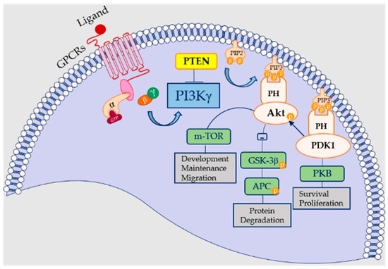 Representation of the main signalings in immune cells. Upon G protein-coupled receptors (GPCRs), PI3Kγ catalyzes the PIP3 formation from PIP2. PIP3 binds target proteins, as Akt and PDK1, with PH domains activating intracellular pathways, as development and maintenance through m-TOR and as survival and proliferation through PKB. PIP3 can also mediate protein degradation through GSK-3β signaling. PTEN can inhibit PI3Kγ signaling through PIP3 dephosphorylation.