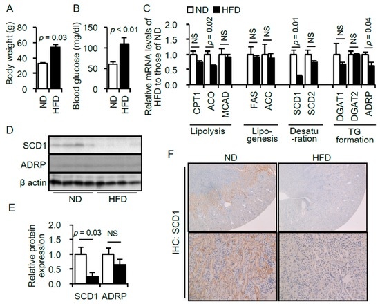 Body weight (A) and blood glucose levels (B) of mice fed with either normal diet (ND, n = 5) or high-fat diet (HFD, n = 5); (C) Expression levels of mRNAs related to lipid metabolism in the kidneys of mice fed an ND or a HFD. Data are expressed as a relative ratio to the ND group; (D) Representative immunoblot of SCD1 and ADRP. β-actin was used as a loading control; (E) Quantitative results of the immunoblots. Data are expressed as a relative ratio to the ND group. p < 0.05 indicates statistical significance; (F) Immunohistological analysis of SCD1 in kidney sections of mice fed an ND or a HFD. Magnification: ×40 (upper), ×200 (lower). Data are shown as mean ± SD. p < 0.05 indicates statistical significance. NS indicates no significance. CPT1, carnitine palmitoyltransferase 1; ACO, acetyl coenzyme A oxidase; MCAD, medium-chain acyl-CoA dehydrogenase; FAS, fatty acid synthase; ACC, acetyl-CoA carboxylase; SCD, stearoyl-CoA desaturase; DGAT, diacylglycerol transferase; ADRP, adipose differentiation-related protein.