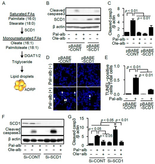 (A) Schema representing the formation of neutral lipid droplets from saturated free fatty acids (FAs) such as palmitate and stearate; (B) Representative immunoblot of cleaved caspase 3 and SCD1 in cultured proximal tubular cells infected with the control retrovirus (pBABE-CONT) or the retrovirus for SCD1 overexpression (pBABE-SCD1), and treated with/without palmitate or oleate. β-actin was used as a loading control; (C) Quantitative result of cleaved caspase 3 (n = 5); (D) Representative pictures of TUNEL staining under the indicated conditions. White arrows indicate TUNEL-positive apoptotic cells; (E) Quantitative results of TUNEL staining; (F) Representative immunoblot of cleaved caspase 3 and SCD1 in cultured proximal tubular cells transfected with the control siRNA or siRNA against SCD1, and treated with/without palmitate or oleate; (G) Quantitative result of cleaved caspase 3 (n = 7). SCD, stearoyl-CoA desaturase. Data are shown as mean ± SD. p < 0.05 indicates statistical significance.