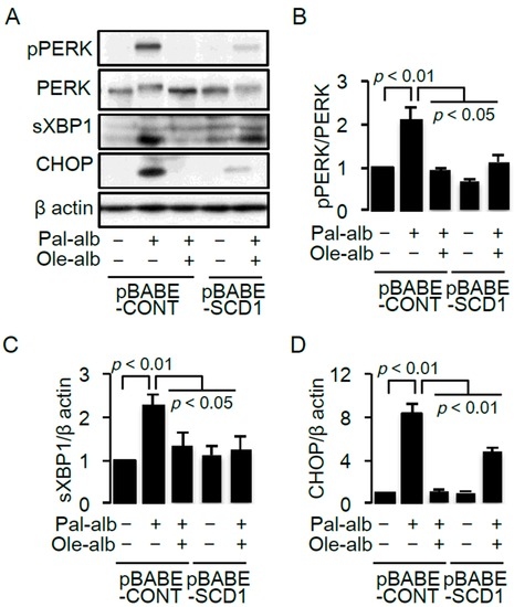 Endoplasmic reticulum (ER) stress is strongly associated with saturated FA-induced apoptosis in a variety of cells [26,27,28]. Enhanced ER stress, determined by protein kinase RNA-like endoplasmic reticulum kinase (PERK) phosphorylation and XBP1 splicing, was confirmed in cultured proximal tubular cells exposed to palmitate, accompanied by overexpression of CCAAT-enhancer-binding protein homologous protein (CHOP), a transcriptional factor responsible for ER stress-induced apoptosis (Figure 3A−D). The palmitate-bound albumin-induced increase in ER stress was significantly inhibited by either oleate treatment or a retroviral-mediated overexpression of SCD1 (Figure 3A−D).