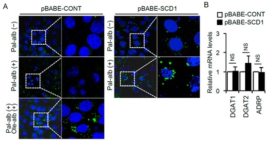 (A) Representative BODIPY staining for visualizing intracellular neutral lipid accumulation in cultured proximal tubular cells infected with the control retrovirus (pBABE-CONT) or the retrovirus for SCD1 overexpression (pBABE-SCD1), and treated with/without palmitate or oleate; (B) mRNA expression levels of DGAT1, DGAT2 and ADRP (n = 6). Data are shown as mean ± SD. NS indicates no significance. DGAT, diacylglycerol transferase; ADRP, adipose differentiation-related protein.