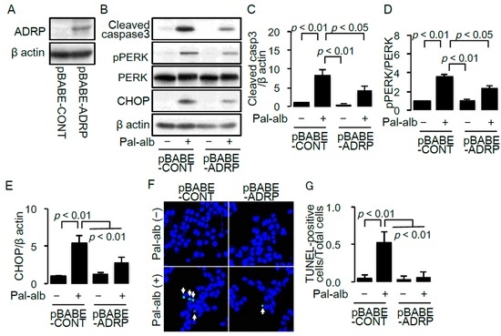 To confirm the anti-apoptotic effect of lipid droplet formation in cells treated with saturated FA-bound albumin, we generated a cell line overexpressing ADRP [29]. ADRP overexpression was confirmed by western blot analysis (Figure 5A). Overexpression of ADRP significantly decreased caspase 3 cleavage (Figure 5B,C) and the number of TUNEL-positive apoptotic cells (Figure 5C,F). Furthermore, overexpression of ADRP ameliorated the palmitate-bound albumin-induced ER stress characterized by increased PERK phosphorylation and CHOP expression (Figure 5B,D,E). These results suggest that enhancing lipid droplet formation has a cytoprotective role against saturated FA-mediated cell toxicity.