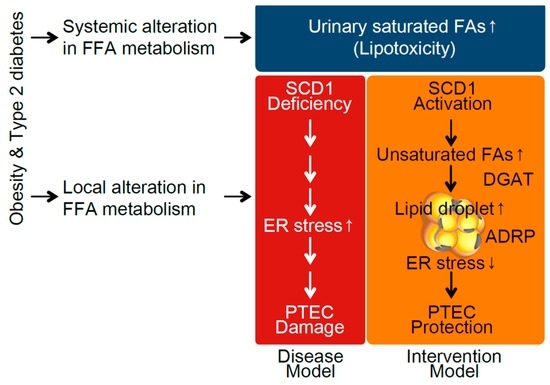 Two types of renal lipotoxicity have been reported to be associated with the pathogenesis of diabetic nephropathy so far. One is urinary FFA-bound albumin-induced PTEC damage [16], which is mediated by systemic alteration in FFA metabolism. The other one is the alteration of intra-renal FFA metabolism [23]. The relationship between each of the two and the pathogenesis of diabetic complications has been independently mentioned so far. However, based on our results, there is a strong possibility that systemic and local tissue alterations in FFA metabolism synergistically contribute to the development of lipotoxicity-mediated cell damage in diabetes (Figure 6). This idea provides a novel research concept in diabetic complications. Hence, the interaction between systemic and local tissue changes in FFA metabolism should be more precisely investigated to establish a novel therapy for reducing lipotoxicity. Growing evidence suggests that SCD1 activation plays a cell-protective role in various metabolic tissues as well as kidney cells [32,33,34], and thus an SCD1 activator is expected to become a novel therapy for preventing disease progression associated with diabetes. However, SCD1 inhibition has also been suggested to be a new therapeutic target for preventing type 2 diabetes itself, because SCD1 knockout mice showed resistance to HFD-induced obesity and insulin resistance [35]. Thus, whether SCD1 should be systemically inhibited or activated in diabetic patients is still under debate, although SCD1 activation is likely to be a good candidate, at least in kidney cells under diabetic conditions. Furthermore, we demonstrated the effectiveness of SCD1 activation only in an in vitro cell culture study. To draw a final conclusion, further studies using kidney-specific SCD1 transgenic or knockout mice are required.