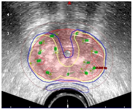 All included patients (n = 79) underwent HDR-BT after informed patient consent at the time of their treatment. Digital rectal examination, PSA, computerized tomography (CT), and a Technecium-99 bone scan was mandatory. Risk stratification was done as per the National Comprehensive Cancer Network (NCCN), which defines low-risk as PSA ≤ 10 ng/mL, T1c-T2 and a Gleason score (GS) ≤ 6; intermediate risk as PSA 10–20 ng/mL or GS 7; and high risk as a PSA > 20 ng/mL, T3, or GS 8–10. PSA measurements were performed with ElektroChemiLumineszenzImmonoAssay (ELCIA) by Roche Diagnostics GmbH, in accordance with WHO standards. We evaluated and documented the D’Amico risk stratification for PCa for each patient. Exclusion criteria were surgically positive lymph node metastases, distant metastasis, and prior pelvic radiotherapy. Patients with bladder outlet obstruction, patients who already had transurethral operations, and patients with a prostate volume of more than 100 cm3 were also excluded. All patients had neoadjuvant and adjuvant androgen deprivation therapy (ADT) for at least two years starting after laparoscopic pelvic lymphadenectomy.
