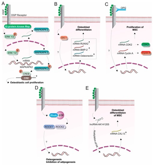Fei et al. [55] found that OGP stimulates the proliferation of MSCs derived from OPG-deficient mice (OPG, osteoprotegerin) by triggering the Cyclin-dependent kinase–cyclin A (CDK2–cyclin A) pathway, since they observed expression of CDK2 and cyclin A, both at the mRNA and protein levels. OGP might also interact with OPG once the absence of OPG might cut down the effect of OGP on MSC osteoblastic differentiation (Figure 2C).