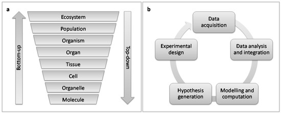 Concepts in systems biology approaches. (a) Holistic (top-down) vs. reductionist (bottom-up) approaches to study and integrate the various levels of biological systems; and (b) an iterative process that is used to generate data and model a biological system.