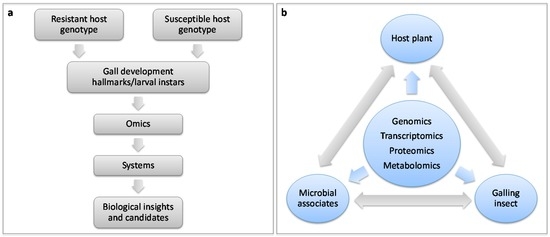 In the last decade omics technologies have provided a new and potent means for improving the knowledge of plant-galling insect interactions. In order to initiate gall induction, it is essential that the insect assume control of its host’s cellular machinery. There is a growing body of evidence supporting the involvement of a diverse array of effector proteins and induced phytohormonal imbalances in galling. However, to interrogate an interaction, a controlled and reliable plant-pest system must be developed (Figure 2a). Microscopy will be a useful tool in identifying important time points during gall or insect development that can be queried using omics approaches (Figure 2a). The development of such a model system will fill an important gap in plant-galling insect research where there is currently a paucity of information linking different biological levels into a coherent system (Figure 1a and Figure 2a). The studies discussed herein typically comprised pairwise interactions between host and pest, whilst this is rarely the case under natural conditions. Investigating the targets of effectors and phytohormones, where and how they act during infestation, as well as the contribution of microbial associates to gall induction will be important questions for future studies exploring plant-galling insect interactions (Figure 2b).