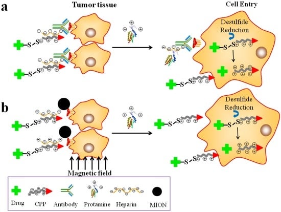 In order to safe control this CPP “Trojan Horse”-led intracellular drug delivery, “smart” systems were developed using the heparin/protamine-regulated prodrug protection/deprotection strategy [,,]. This system was made up of two major components: (a) a targeting compartment that consisted of a heparin-linked tumor-targeting unit such as an antibody (Figure 3a) or the magnetic iron oxide nanoparticle (MION) carrier (Figure 3b); and (b) a drug compartment composed of a covalent conjugate of the polycationic CPPs (e.g., TAT and LMWP) and macromolecular drugs (e.g., protein and siRNA) in achieving potent intra-tumoral drug therapy [,,,,]. The charge-based prodrug behavior was self-assembled via the strong electrostatic binding between the polyanionic heparin motif on the targeting component and the poly-cationic CPP on the drug component. Both systems possessed dual active- (via the antibody or an external magnetic force) and passive- (via the EPR effect [,]) targeting functions as well as the potent CPP-mediated cell-internalization features. Once the prodrug complexes were being accumulated at the tumor site, the CPP-linked drug conjugates were released by the administration of protamine, a clinical heparin antidote that possessed a stronger binding affinity to heparin than the CPP). Following their detachment from the targeting component, the CPP-linked drug conjugate would internalize tumor cells, leading to potentially a non-invasive, clinically-enabled yet safe treatment of the tumors (see Figure 3).