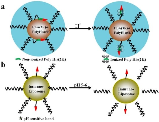 Examples of the pH-sensitive nano-carriers equipped with an efficient CPP exposure: (a) polyHis-based micelles responded to acidic tumor microenvironments by an efficient CPP exposure; and (b) TAT-peptide-decorated liposomes comprising a hydrolyzable PEG shell allowing improved exposure of the TAT (redrawn according to [,]).