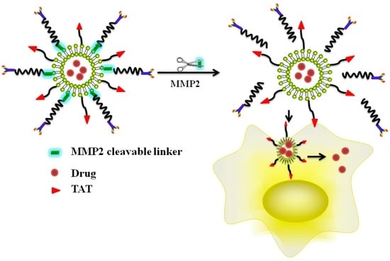Illustration of the MMP2-triggered, CPP-mediated intracellular delivery strategy of drug-encapsulated liposome (Reproduced according to []).