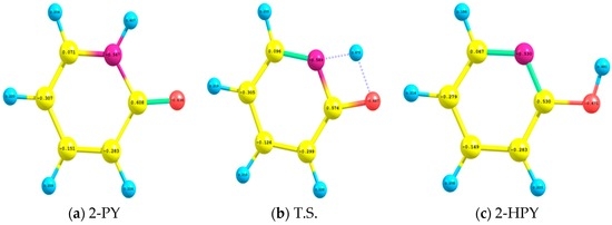 The natural atomic charges of (a) 2-hydroxypyridine (2-PY); (b) the transition state (T.S.); and (c) 2-pyridone (2-HPY) which were calculated by utilizing CAM-B3LYP/aug-cc-pvdz level of theory. For color scheme see caption of Figure 1.