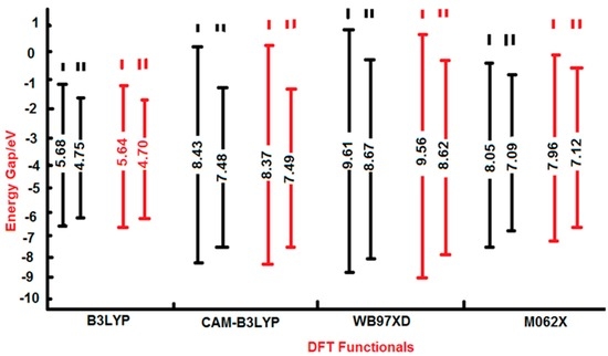 Schematic molecular orbital energy level diagram for the energy gaps of 2-HPY (I); and 2-PY (II) tautomers. It has been drawn using data from B3LYP, CAM-B3LYP, M062X and wB97XD functionals with 6-311++G** (black lines); and aug-cc-pvdz (red lines) basis sets.