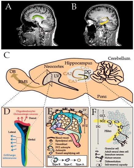 - Quiñones-Hinojosa, A.; Sanai, N.; Soriano-Navarro, M.; Gonzalez-Perez, O.; Mirzadeh, Z.; Gil-Perotin, S.; Romero-Rodriguez, R.; Berger, M.S.; Garcia-Verdugo, J.M.; Alvarez-Buylla, A. Cellular composition and cytoarchitecture of the adult human subventricular zone: A niche of neural stem cells. J. Comp. Neurol. 2006, 494, 415–434. [Google Scholar] [CrossRef] [PubMed]