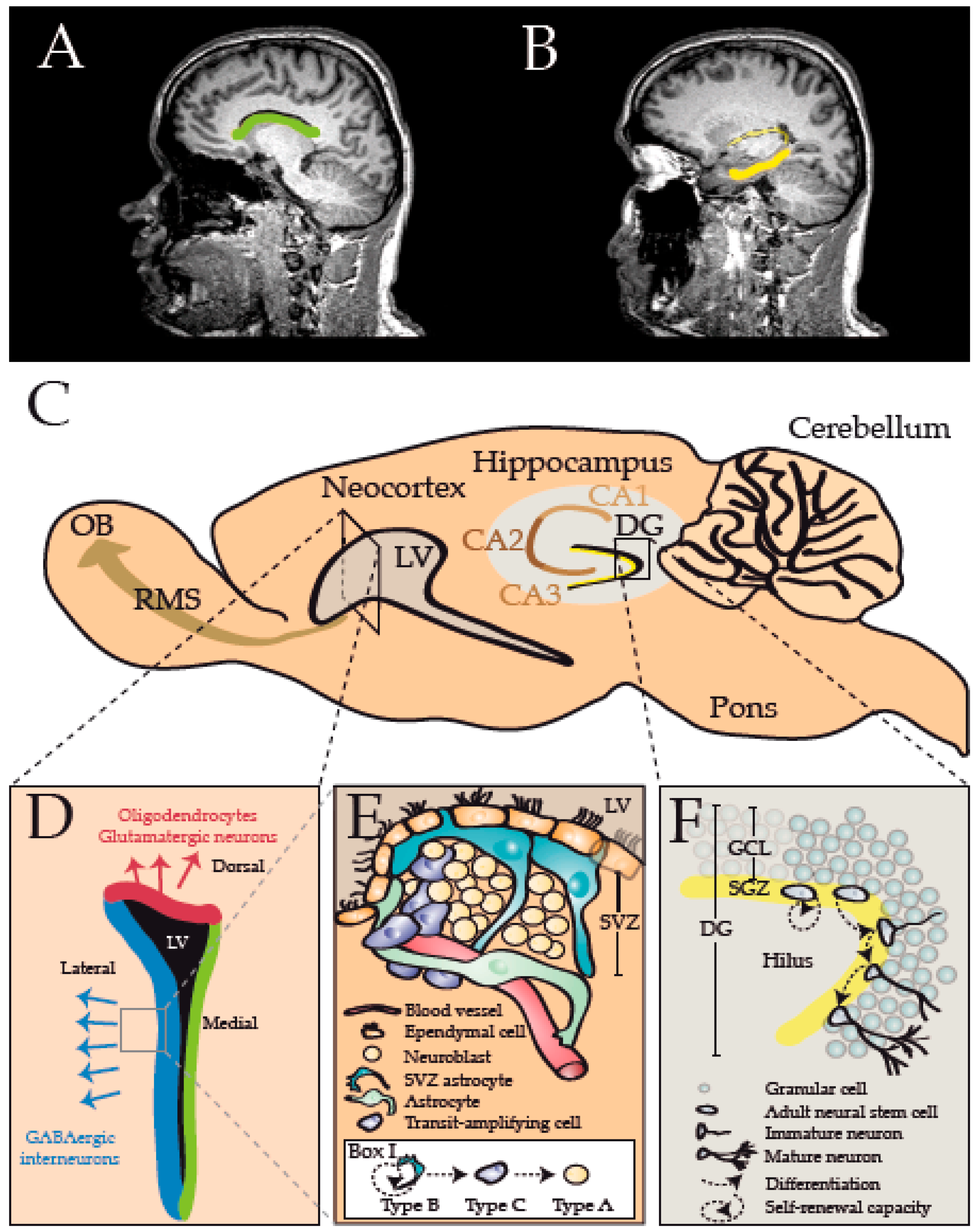 The mammalian central nervous system (CNS) comprises two major stem cell niches: the subventricular zone (SVZ) lining the lateral ventricles (LV), and the subgranular zone (SGZ) in the dentate gyrus (DG) of the hippocampus, as depicted in the human brain (green and yellow areas on magnetic resonance images (MRI) in (A) and (B), respectively) and rodent brain (C); (D) The SVZ (coronal view) can be divided into different microdomains based on the progenies of neural stem cells (NSCs): whereas the dorsal domain (red) produces predominantly oligodendrocytes (OLs) and glutamatergic neurons, the lateral domain (blue) generates mainly GABAergic interneurons, and the medial domain is largely non-neurogenic after 2.5 months of life; (E) A detailed view of the lateral SVZ shows the microarchitecture of this niche, including self-renewing NSCs (Type B/SVZ astrocyte) that can give rise to transit-amplifying cells (Type C cells). These multipotent progenitors can produce neuroblasts (Type A cells) as well as glial cells, including OLs (Box I). Newly formed neuroblasts usually migrate along the rostral-migratory stream (RMS) to the olfactory bulb (OB), whereas cells determined to become OLs usually migrate into nearby white matter tracts; (F) A close-up view of the SGZ depicts how NSCs (Adult neural stem cells) within the hilus of the DG can self-renew or give rise to neurons that are incorporated into the granular cell layer (GCL). In addition to neuronal cells, NSCs within the SGZ also have the potential generate OLs.