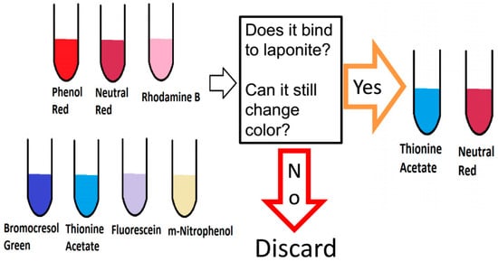 Seven organic dyes (neutral red, thionine acetate, bromocresol green, rhodamine B, phenol red, fluorescein, 3-nitrophenol) were screened with Laponite® (LP) in solution (Figure 1). The clay–dye combinations were analyzed with a UV-Vis spectrophotometer and a spectrofluorimeter (data not shown) at different pH to see if they retained their pH-dependent color change and if they were bound irreversibly to the Laponite®.