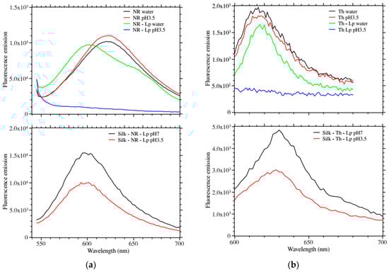 Figure 3a,b show the fluorescence emission of the above films. In solution, only the LP–NR showed a shifted fluorescence emission as compared to the free dye. Remarkably, when lowering the pH to 3.5 both LP–NR and LP–Th fluorescence emissions were completely quenched (Figure 3a,b top panels).