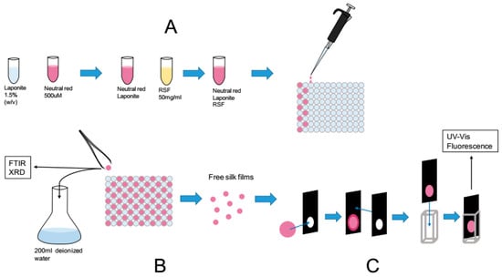 Following our pre-optimization studies we designed a workflow to reproducibly manufacture silk films modified with Laponite® and dyes. Figure 4 illustrates the three main steps. Note that the dye concentrations were kept below the cation exchange capacity of the Laponite® RD (i.e., 55 mEq/100 g).