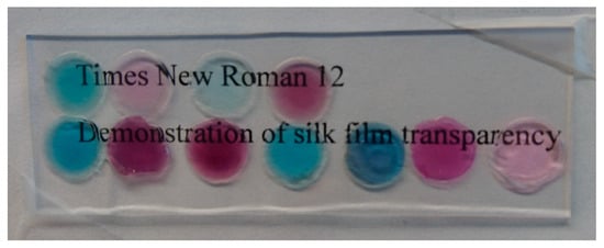 Figure 5 demonstrates the transparency of the obtained silk patches. Here a selected amount of silk patch containing either NR (red) or Th (blue) were placed on a microscope glass slide and behind were lines of text clearly visible. Note that for convenience the patches were wetted to adhere on the glass slide.